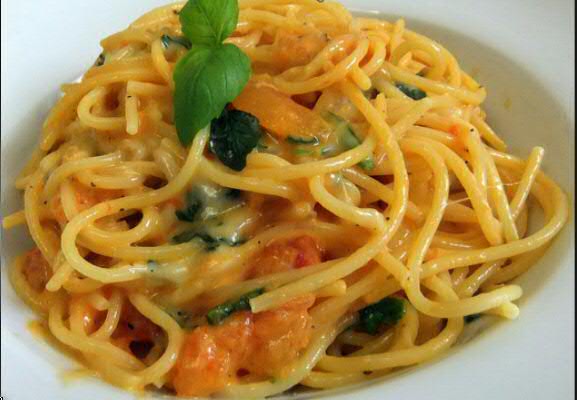 Špagety s česnekovým krémem a zapečenými rajčaty